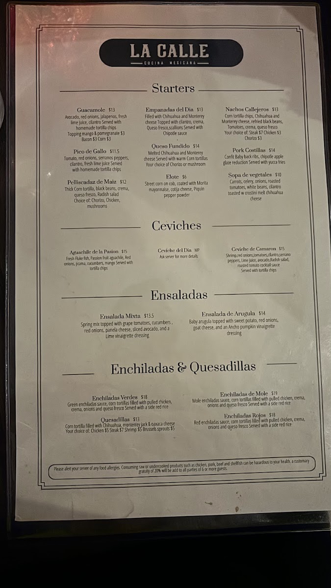 “ La Calle is a hidden gem in Baltimore! The food is packed with flavor, the drinks are great, and the service is top-notch. Everything from the appetizers, entrees, and dessert was fresh and beautifully presented. Perfect spot for a casual night out or a special dinner. Can’t wait to return! ”